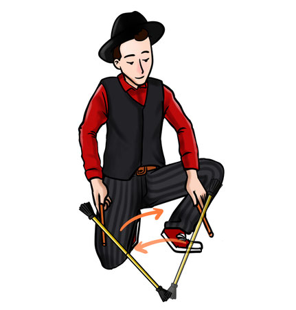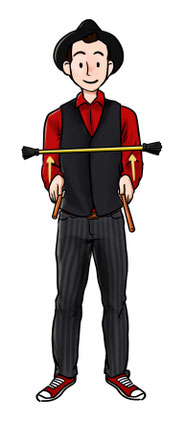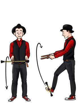 So entsteht eine gleichmässige Hin-und-her-Bewegung, ähnlich wie bei einem Metronom. Wichtig ist, dass die Bewegung locker aus dem Handgelenk kommt und nicht aus dem ganzen Arm. Achte darauf, dass die Schläge gleichmässig und nicht zu stark sind, damit der Mittelstab horizontal bleibt und ruhig pendelt. Beherrschst du dieses einfache Muster, hast du die Grundlage gelegt, um später Kreise, Drehungen und Würfe mit dem Flowerstick zu lernen.