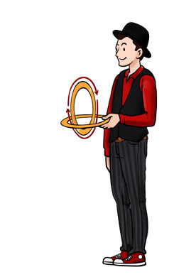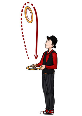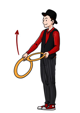 Der Trick für eine erfolgreiche Ringjonglage liegt beim Abwurf: Gib dem Ring aus dem Handgelenk heraus möglichst viel Drehung mit. Die Drehung stabilisiert die Flugbahn des Ringes wie ein sich drehendes Rad des Fahrrads.